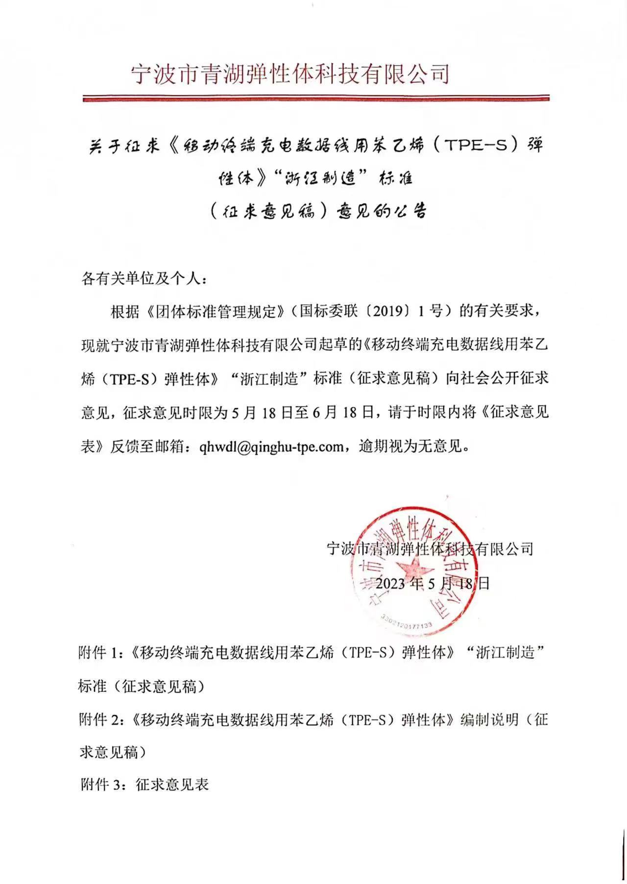 關于征求《移動終端充電數(shù)據(jù)線用苯乙烯(TPE-S)彈性體》“浙江制造”標準(征求意見稿)意見的公告如下: