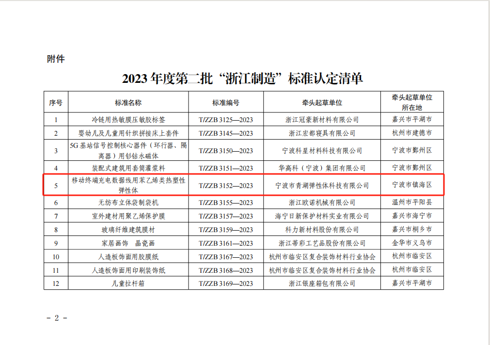 寧波市青湖彈性體科技有限公司牽頭起草的《移動終端充電數(shù)據(jù)線用苯乙烯類熱塑性彈性體》T/ZZB 3152—2023浙江制造團體標(biāo)準(zhǔn)名列其中。