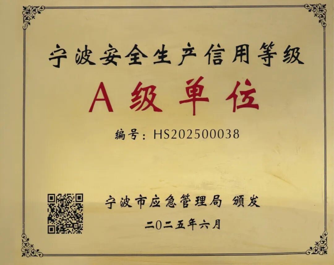 成功斬獲“寧波市安全生產(chǎn)信用等級(jí)A級(jí)”榮譽(yù),這是寧波市對(duì)市場主體安全生產(chǎn)綜合能力的最高級(jí)別認(rèn)可。